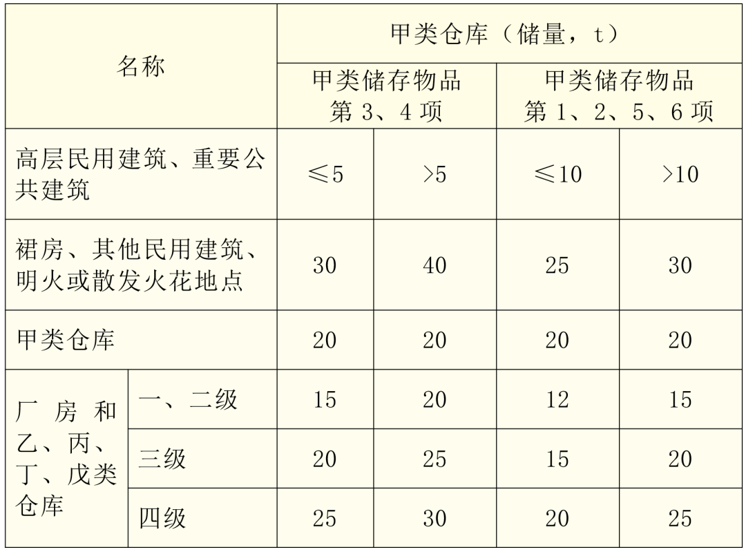 甲类危险化学品仓库与其他建筑、明火地点等的防火间距,需根据仓库储存物品类别、储量及相邻建筑的耐火等级综合确定(具体数据见下表)。