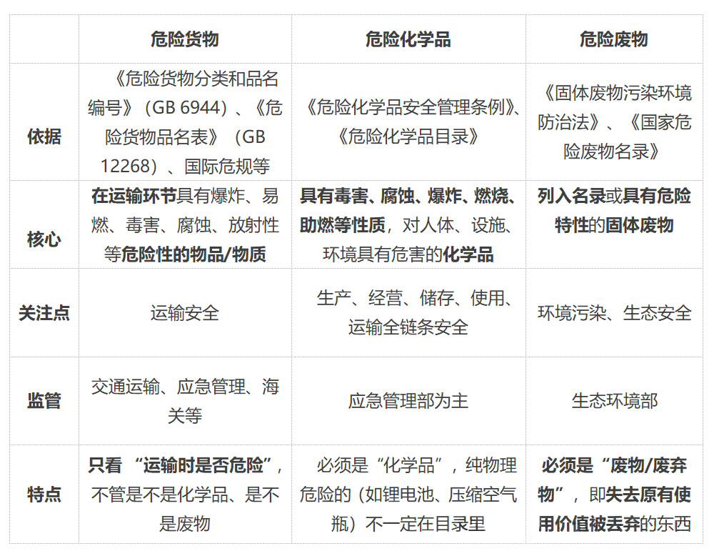答:危险货物、危险化学品、危险废物,定义依据、监管部门、适用场景完全不同,只是在物质上可能重叠。